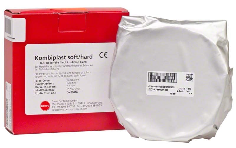 Materiale termoformabile a due strati altamente trasparente in PETG ed EVA. Per bite occlusali ad alto comfort grazie alla superficie rigida e al lato interno morbido.