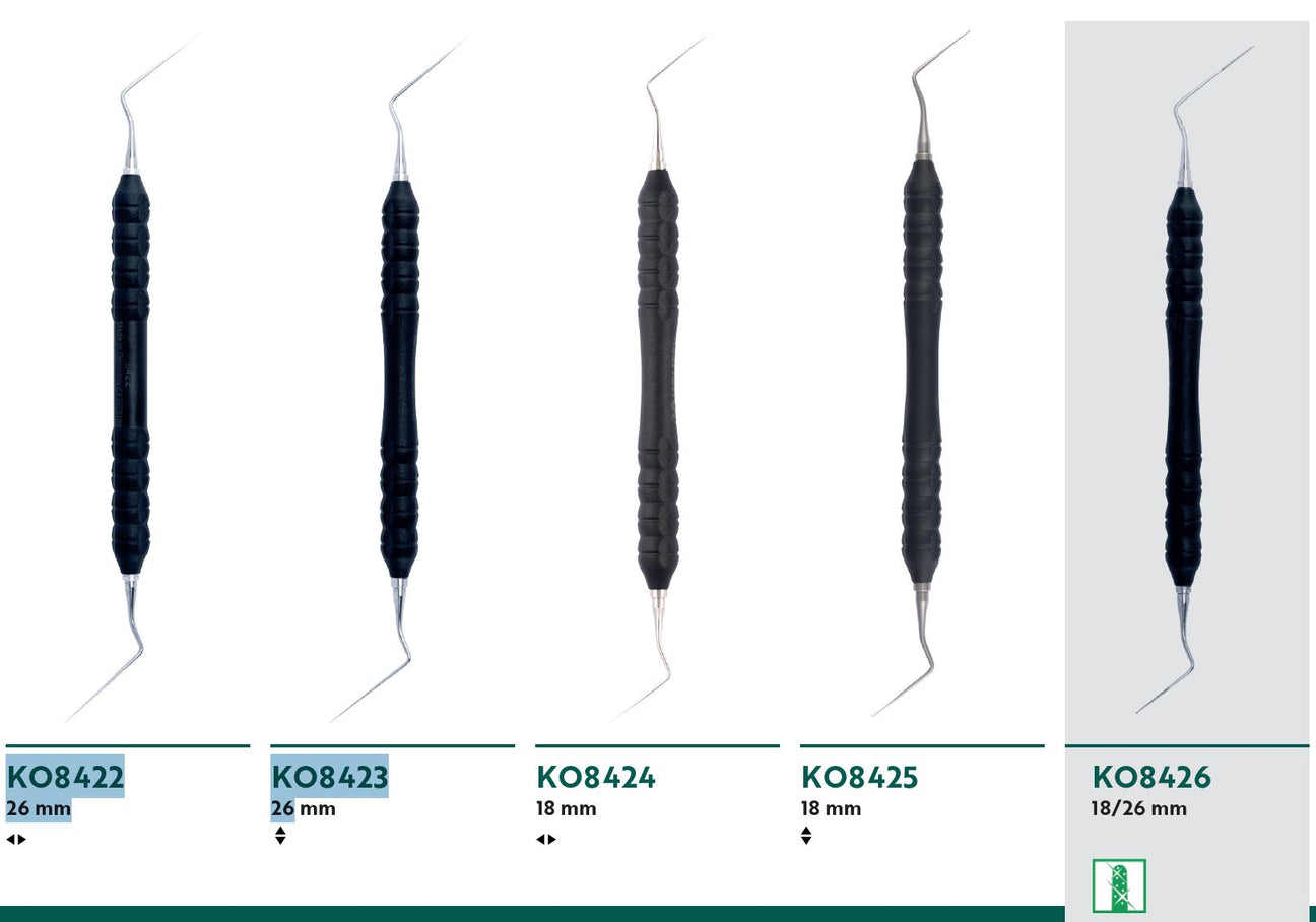 The instruments are available in four versions, suitable for different clinical situations: working end length of 26 mm or 18 mm, hooks to the left/right or up/down.