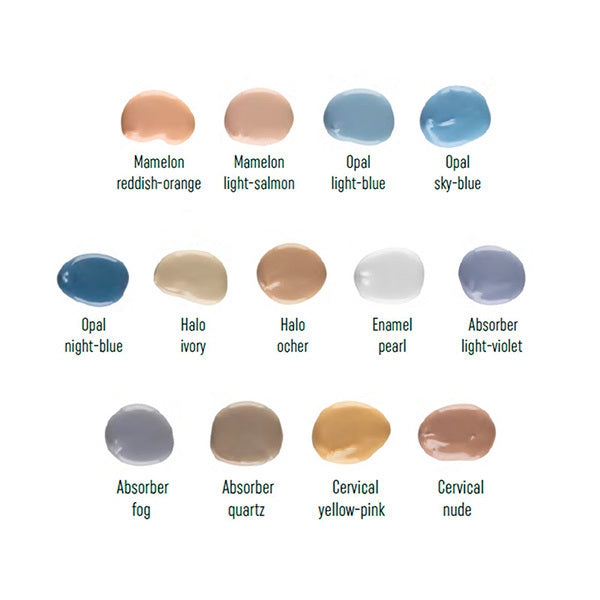 Opal Sky-Blue: Tonalità opalescente blu più visibile. Aggiunge un maggiore effetto vitreo al bordo incisale e migliora la luce in movimento.
