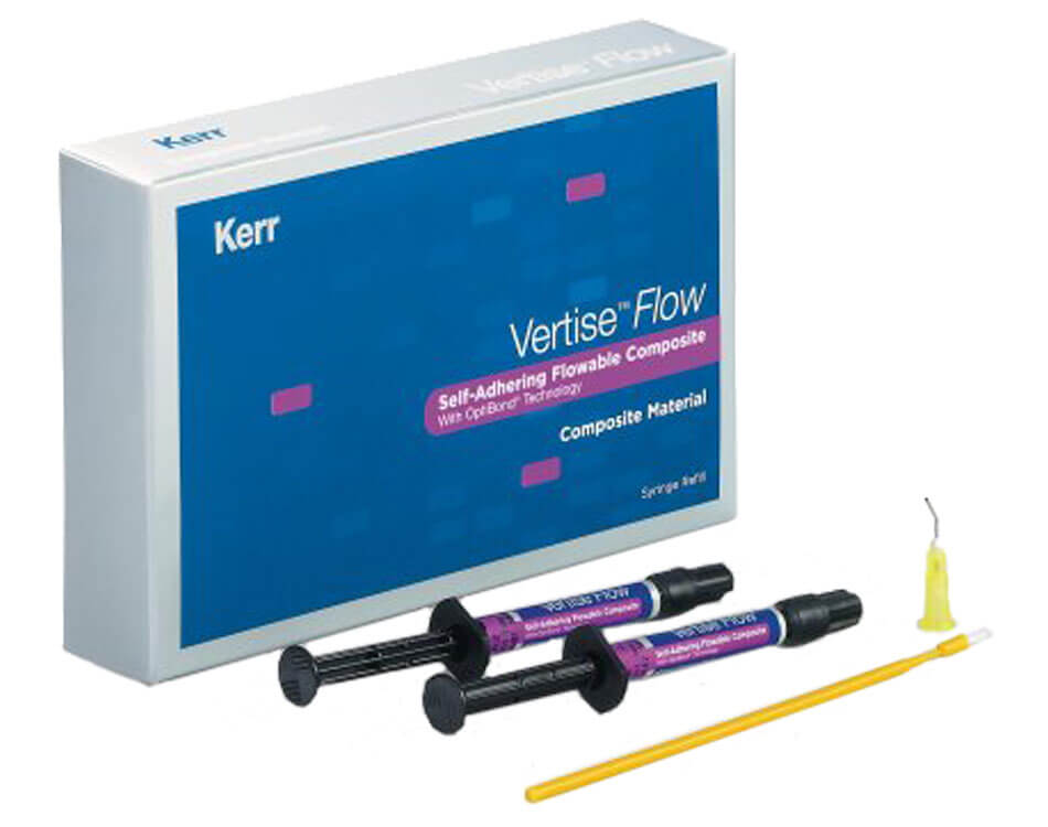 Composito fluido autoadesivo basato sulla tecnologia OptiBond. Incorporando la tecnologia di adesione OptiBond, il composito fluido Vertise Flow elimina i passaggi di mordenzatura/priming/ adesione. Indicato anche per riparazione di restauri in porcellana senza l’utilizzo di alcun primer/silano.